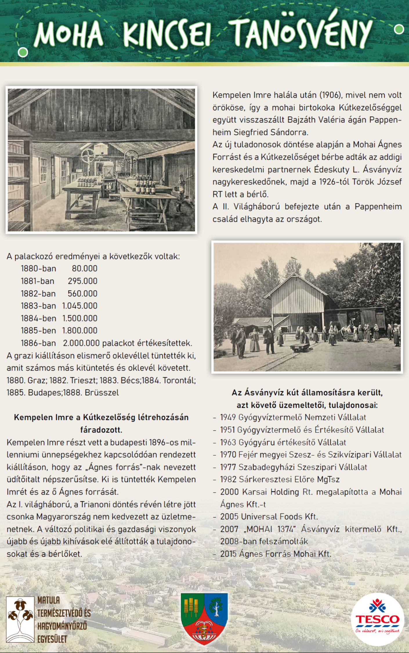Kempelen Imre a Kútkezelőség létrehozásán fáradozott. Részt vett a budapesti 1896-os millenniumi ünnepségekhez kapcsolódóan rendezett kiállításon , hogy az „Ágnes forrás”-nak nevezett üdítőitalt népszerűsítse. Ki is tüntették Kempelen Imrét és az ő Ágnes forrását .