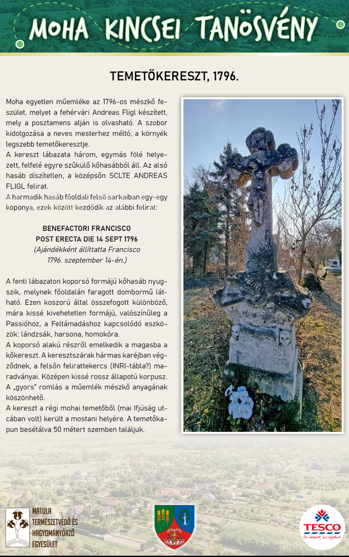 A kőkereszt a Moha Kincsei Tanösvénynek is részét képezi.